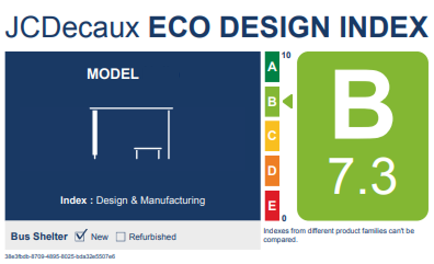 In 2024, we have launched the JCDecaux Eco Design Index (EDI), a tool based on a new methodology audited by an independent third party. The tool goals’ is to access and compare the environmental impacts of our products as well as their performance in terms of eco design. EDI helps to raise awareness among all stakeholders about these important issues and provides the opportunity to make increasingly informed choices internally and externally. The environmental performance is assessed on a scale of 0 to 10. This numerical score is then translated into an index from A to E for a simple and educational representation, “A” corresponding to the best assessment.